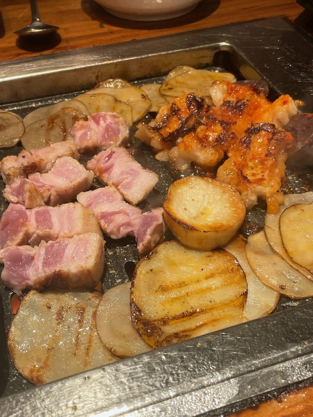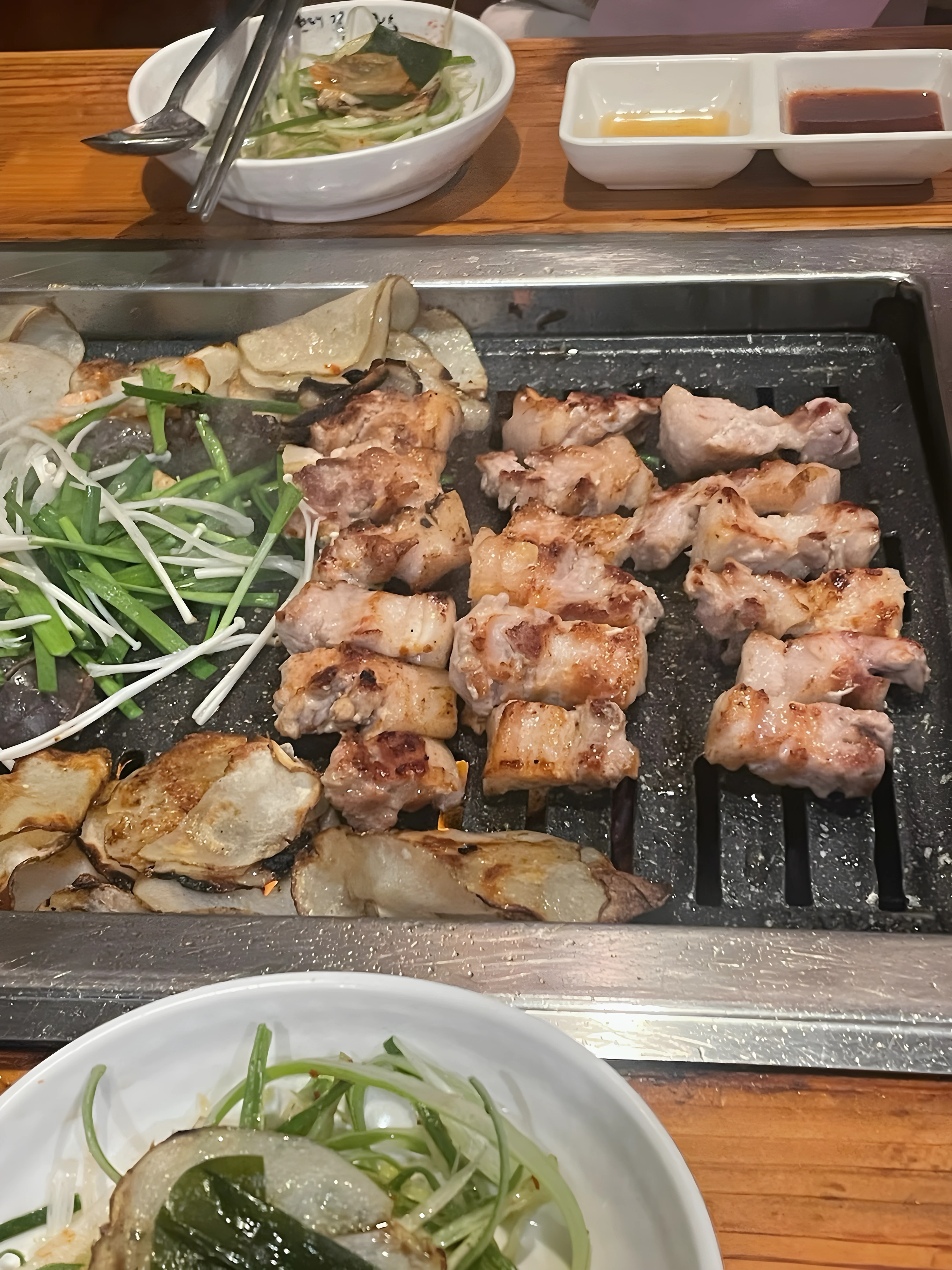 허니감자가 왜 이렇게 극찬을 받는지 고기로 넘기기 전에 한입 먹어봤는데요, 와! 달달하면서 바삭하고 짭조름한 감자가 고기의 맛을 확 살려주더라고요. 나중에 고기랑 같이 먹으면 쌈 싸먹을 때의 감동이 배가 됩니다. 고기+허니감자 조합은 진짜 '신의 한 수'였어요. 명이나물, 와사비, 그리고 짜글이 김치랑 함께 한입 먹으면 뭔가 내 입속은 이미 천국!!